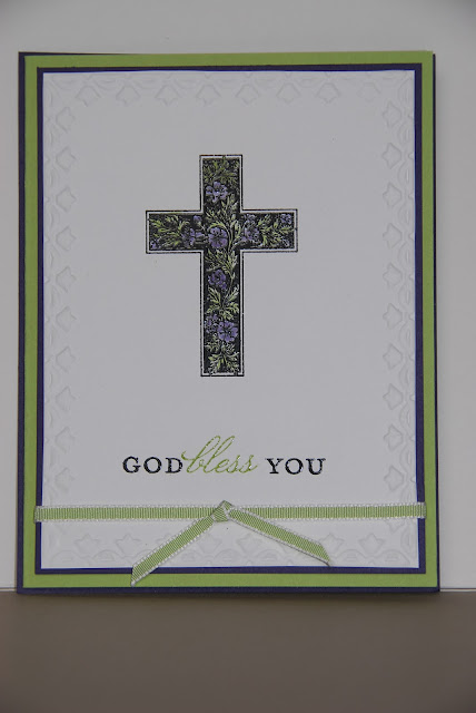 This was a super simple, but elegant at the same time type of card.. I wanted to have the cross to be the central focal point without a lot of other stuff distraction from it. I first dry embossed the front piece of card stock with the Framed Tulip embossing folder. Next, I heat embossed the cross with black embossing powder and then colored in the leaves/flowers with markers. The greeting was stamped twice, once with VerseMark (heat embossed with black embossing powder) then using my Stamp-ma-jig for positioning, I stamped "blessed" with VerseMark and green ink (heat embossed with clear embossing powder). So, there you have it. Super easy, but beautiful.